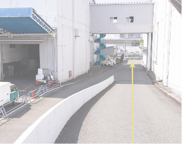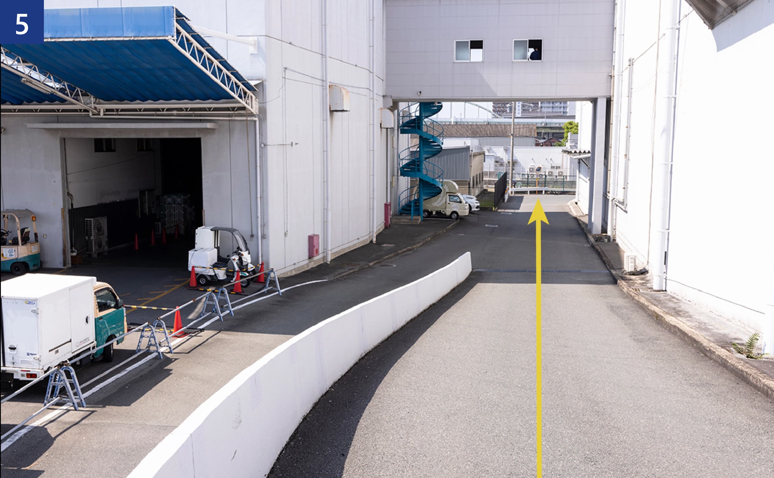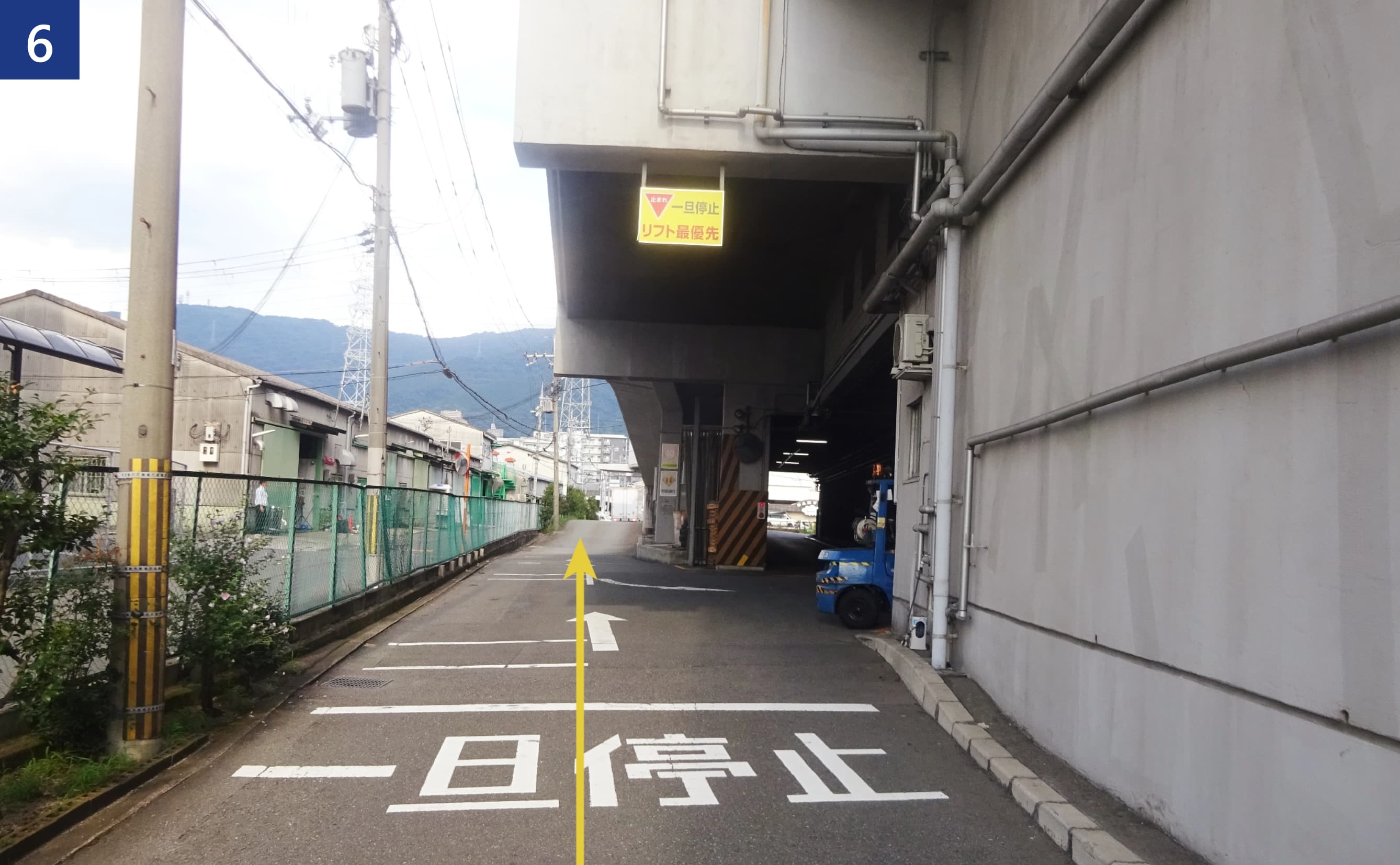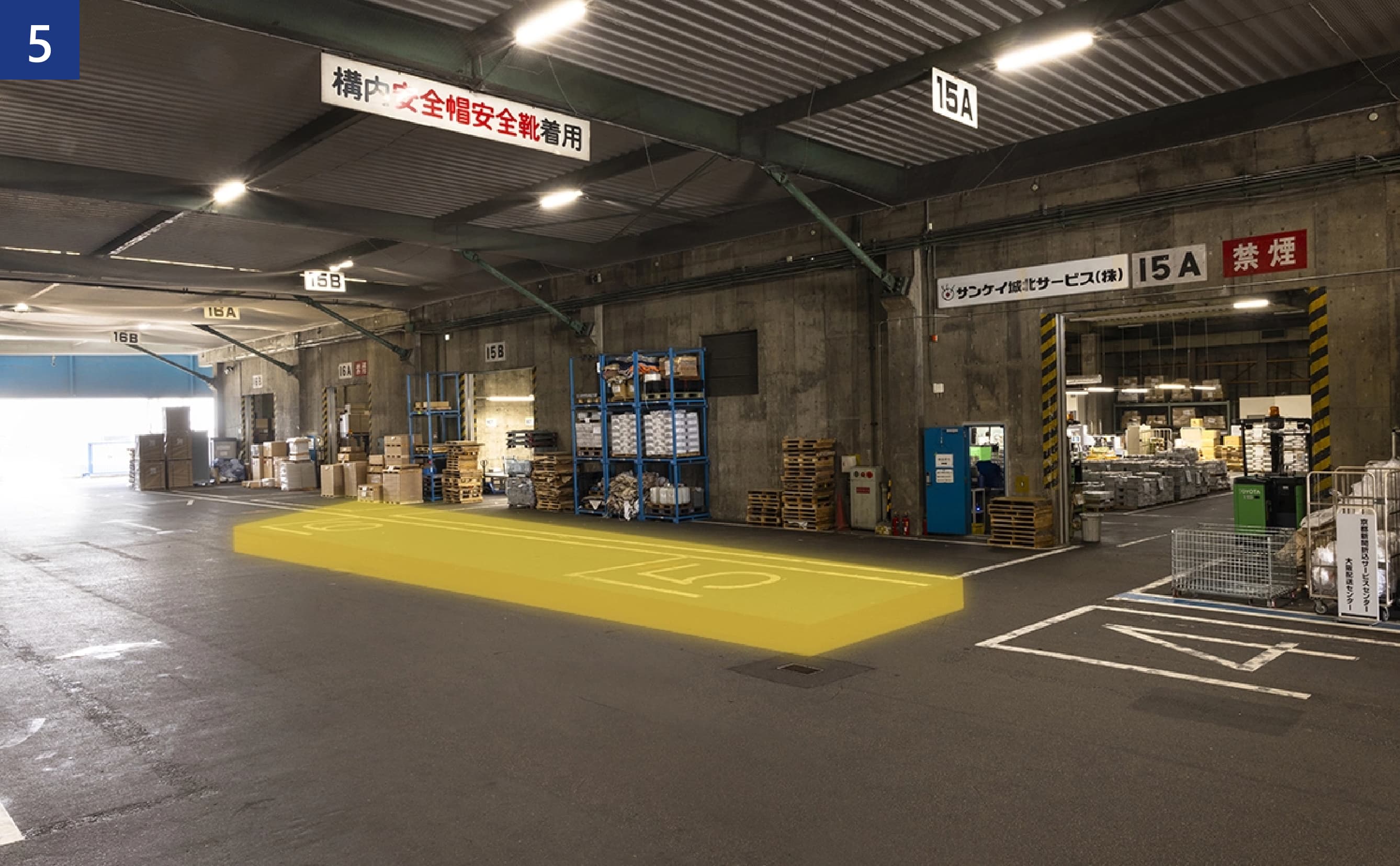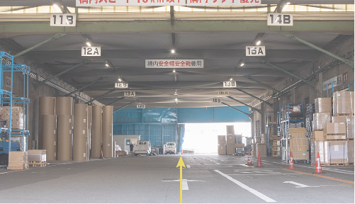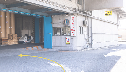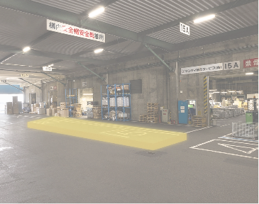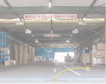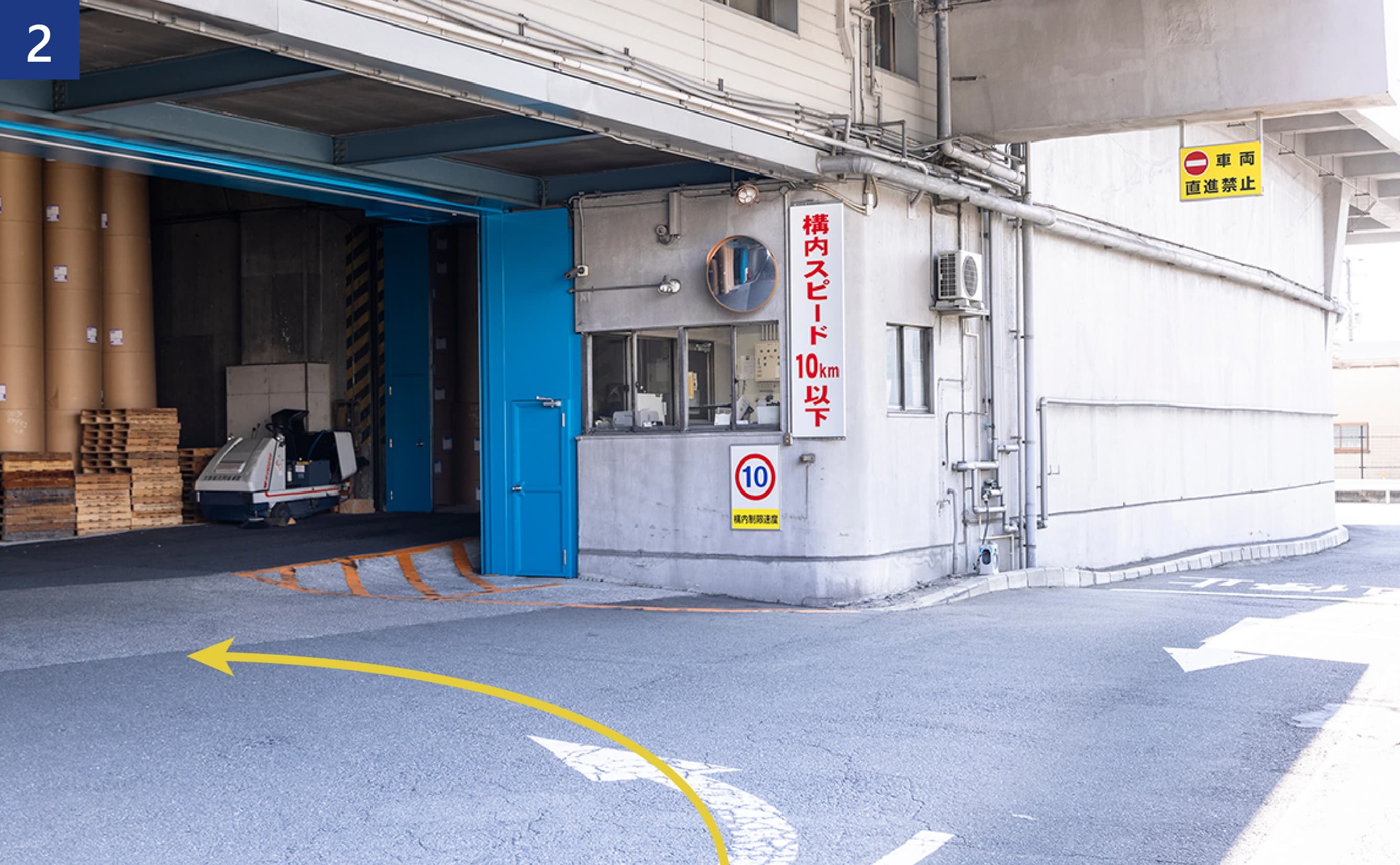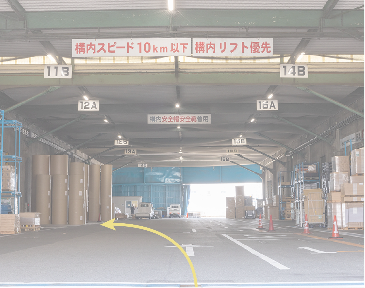 倉庫員(事務員)の誘導に従い1番~6番(3番除く)の枠内に停車 リフトに注意して走行 事務所へ伝票を持参し受付