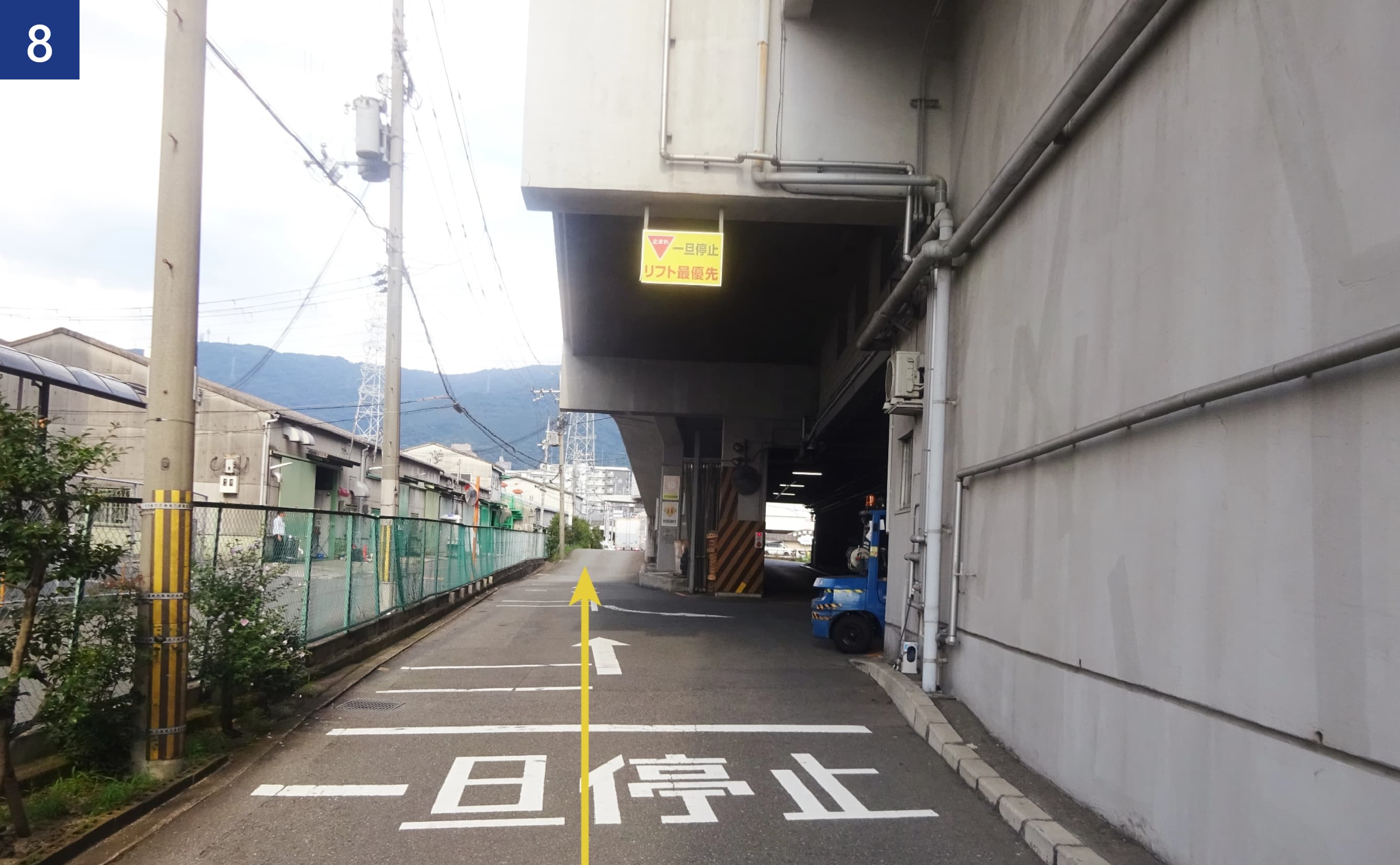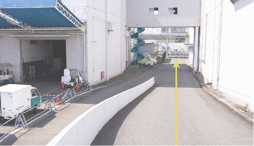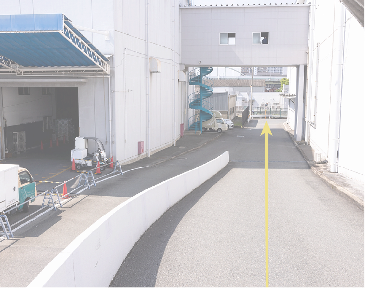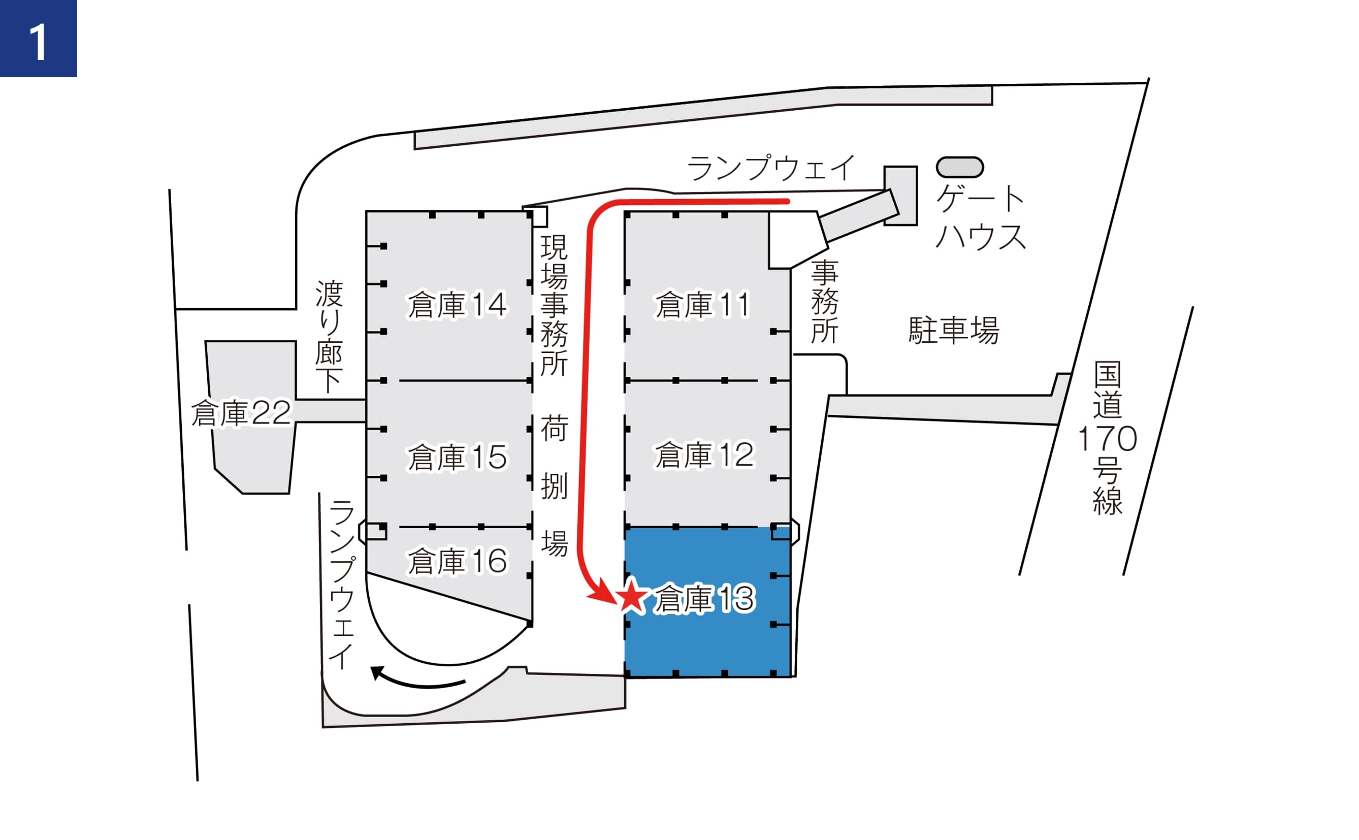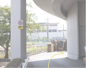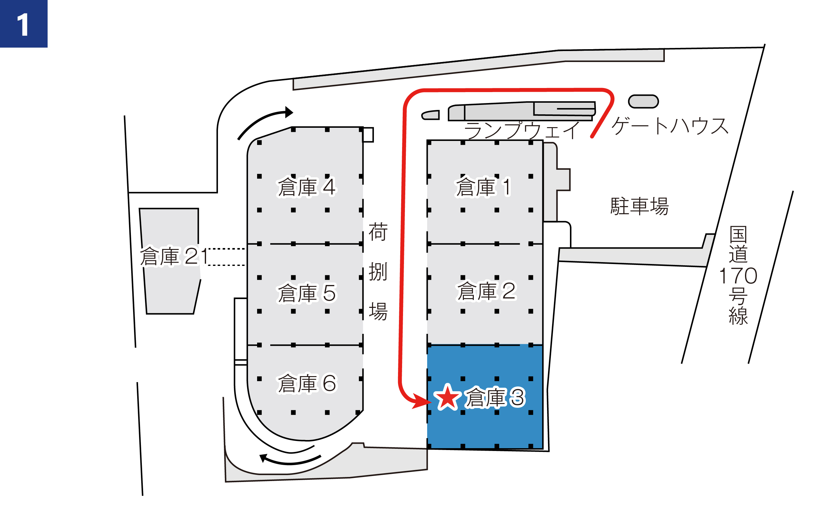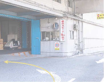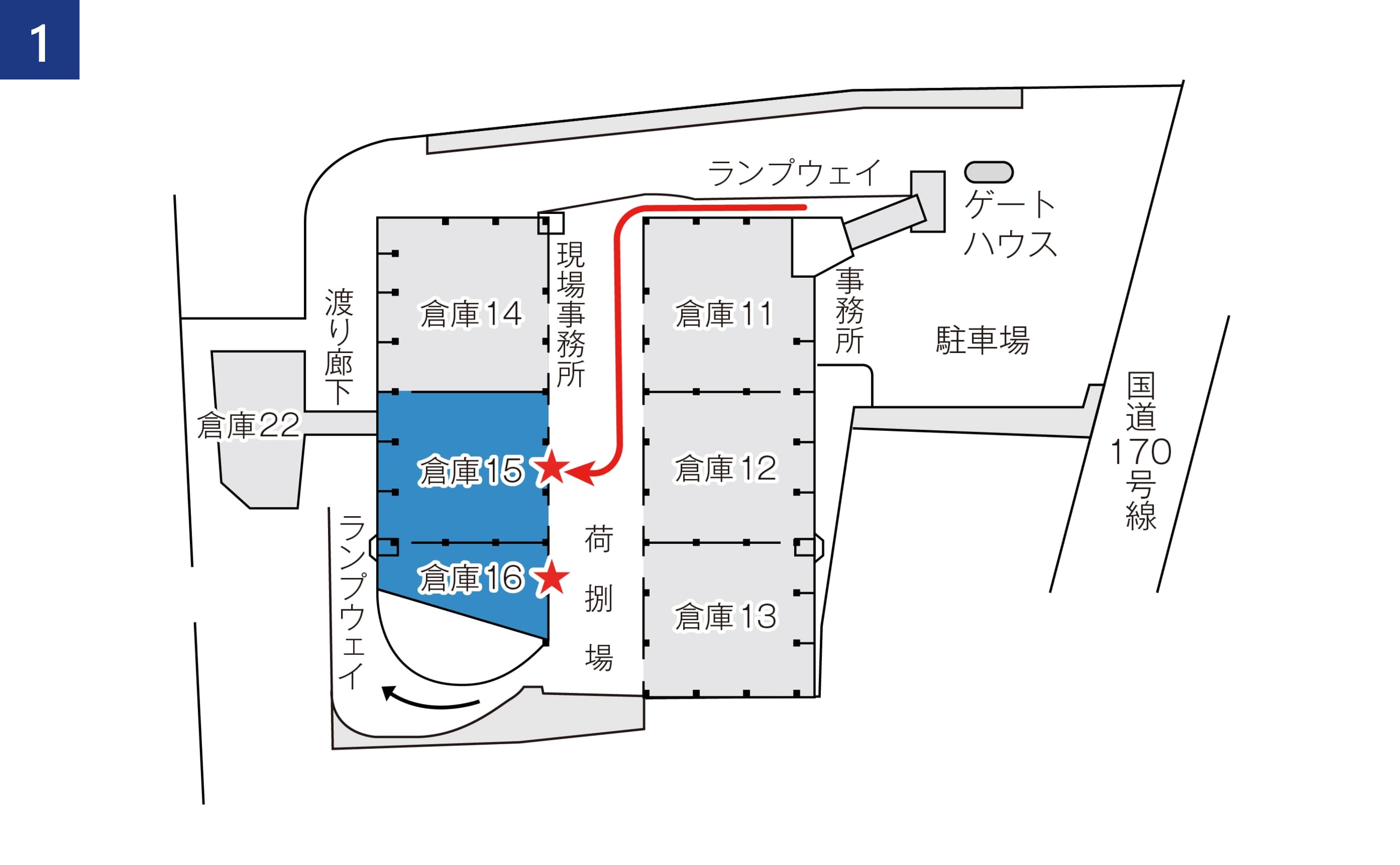 倉庫員(事務員)の誘導に従い1番~6番(3番除く)の枠内に停車 リフトに注意して走行 事務所へ伝票を持参し受付