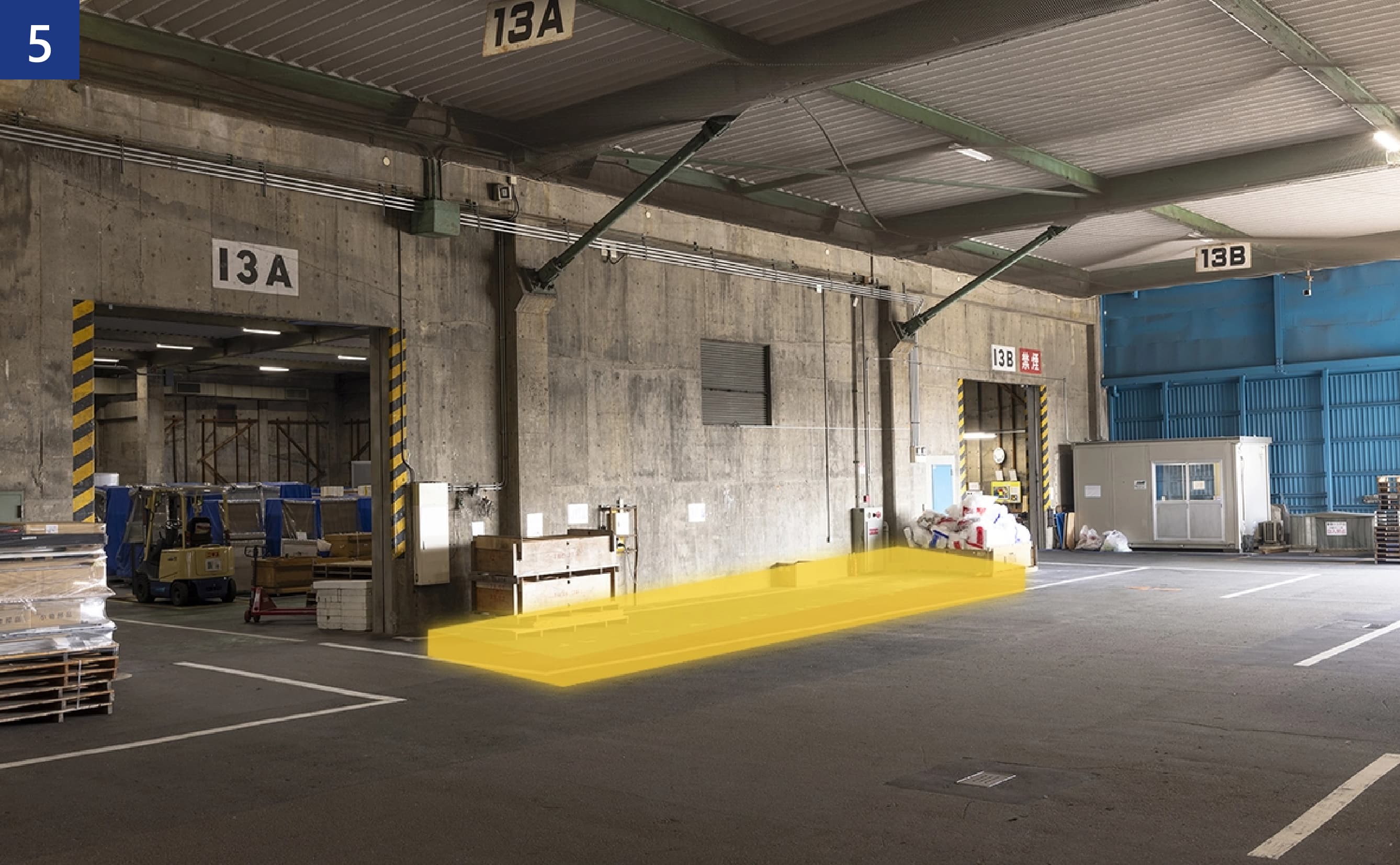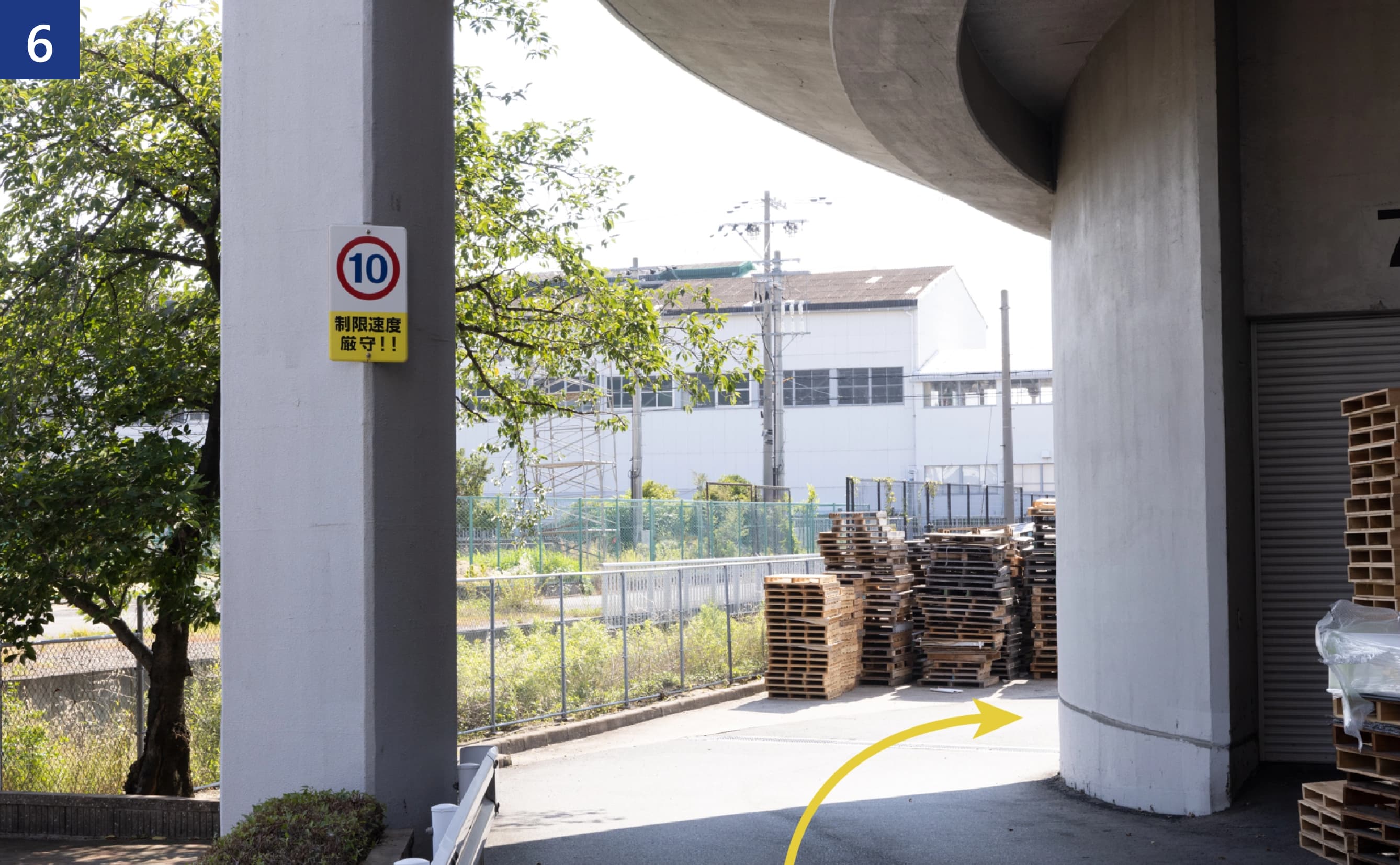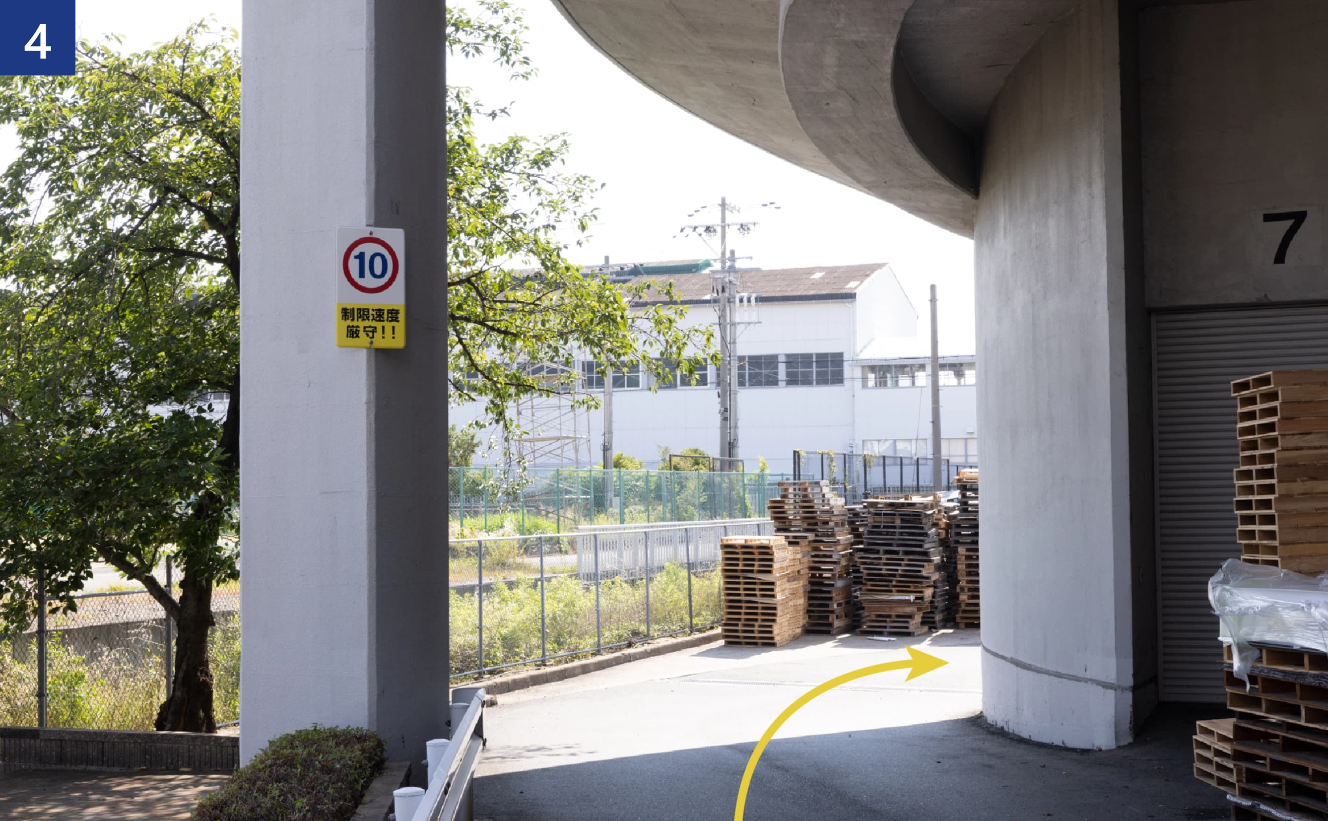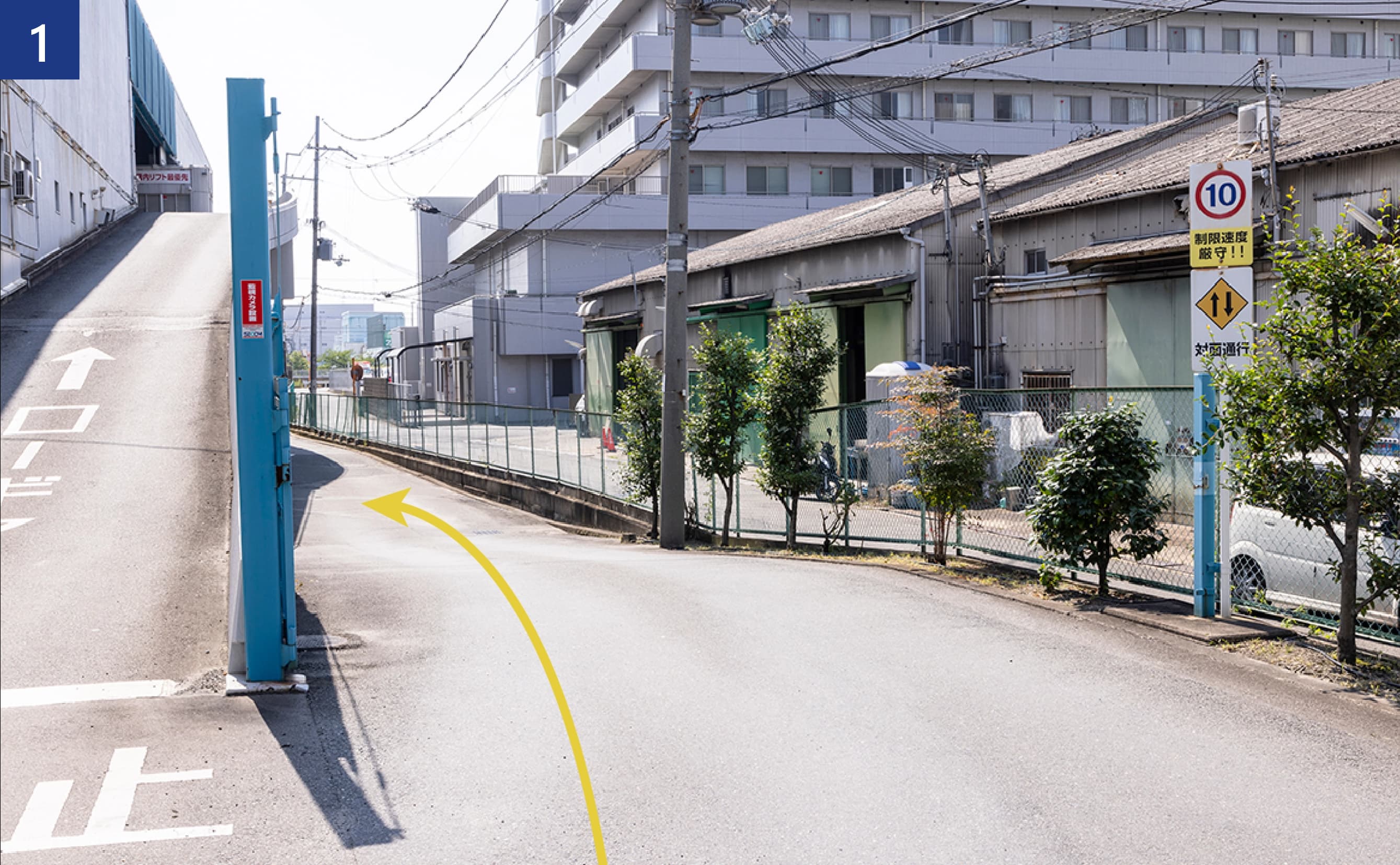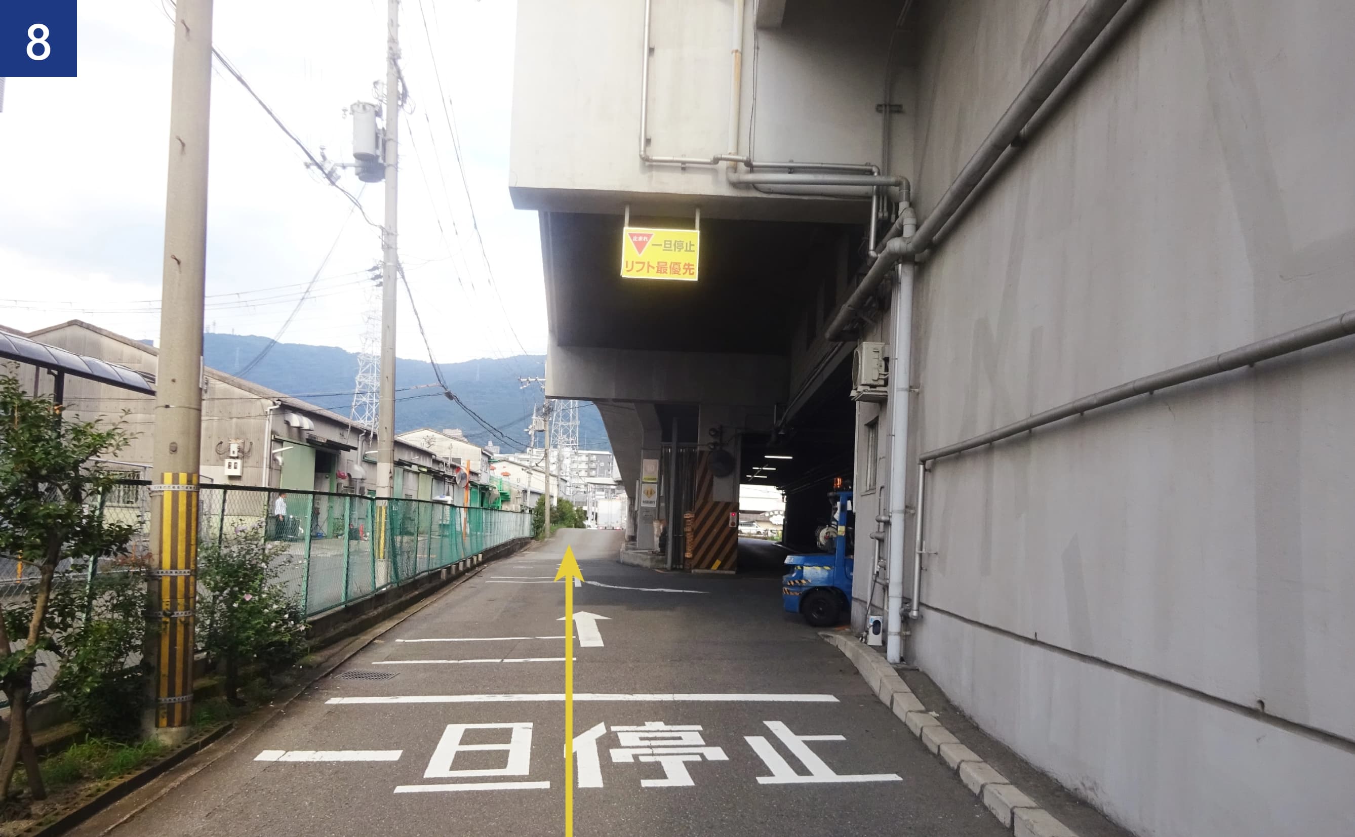 倉庫員(事務員)の誘導に従い1番~6番(3番除く)の枠内に停車 リフトに注意して走行 事務所へ伝票を持参し受付