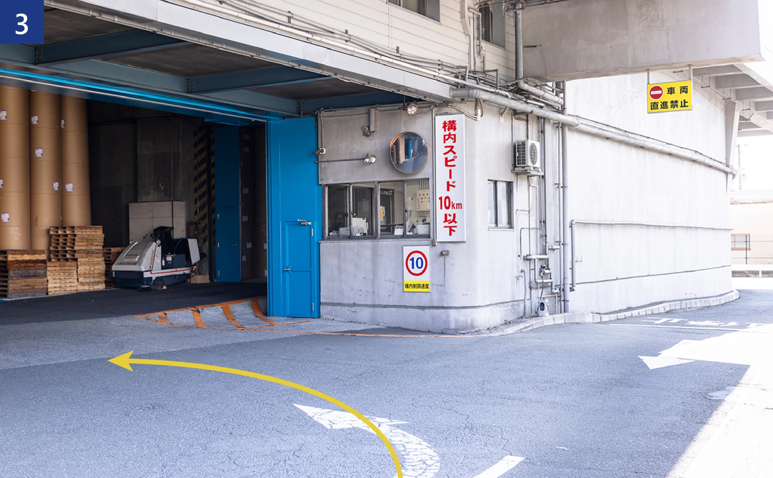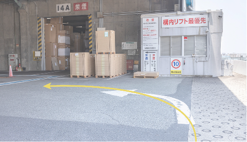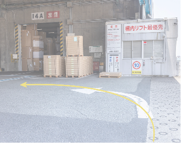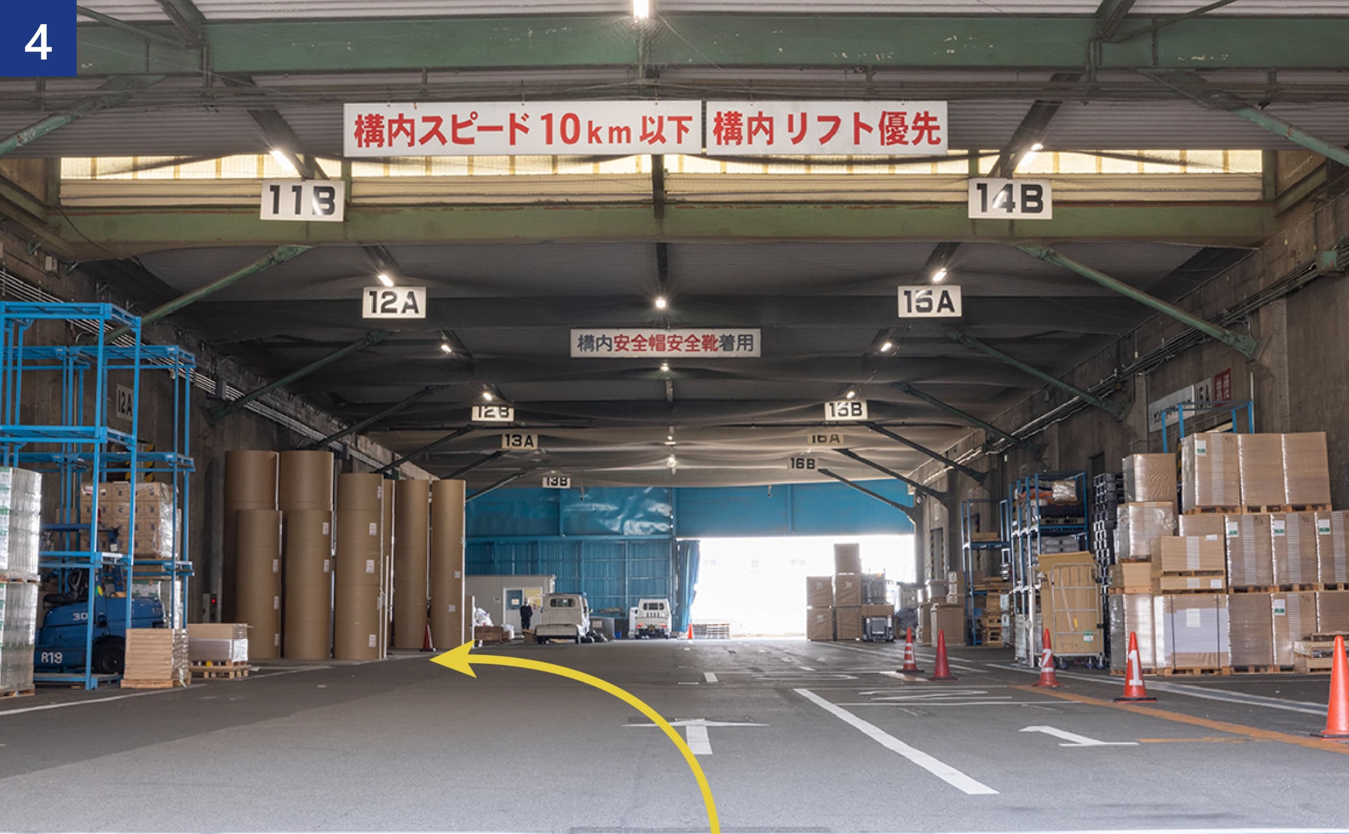 倉庫員(事務員)の誘導に従い1番~3番の枠内に停車 リフトに注意して走行 事務所へ伝票を持参し受付