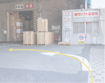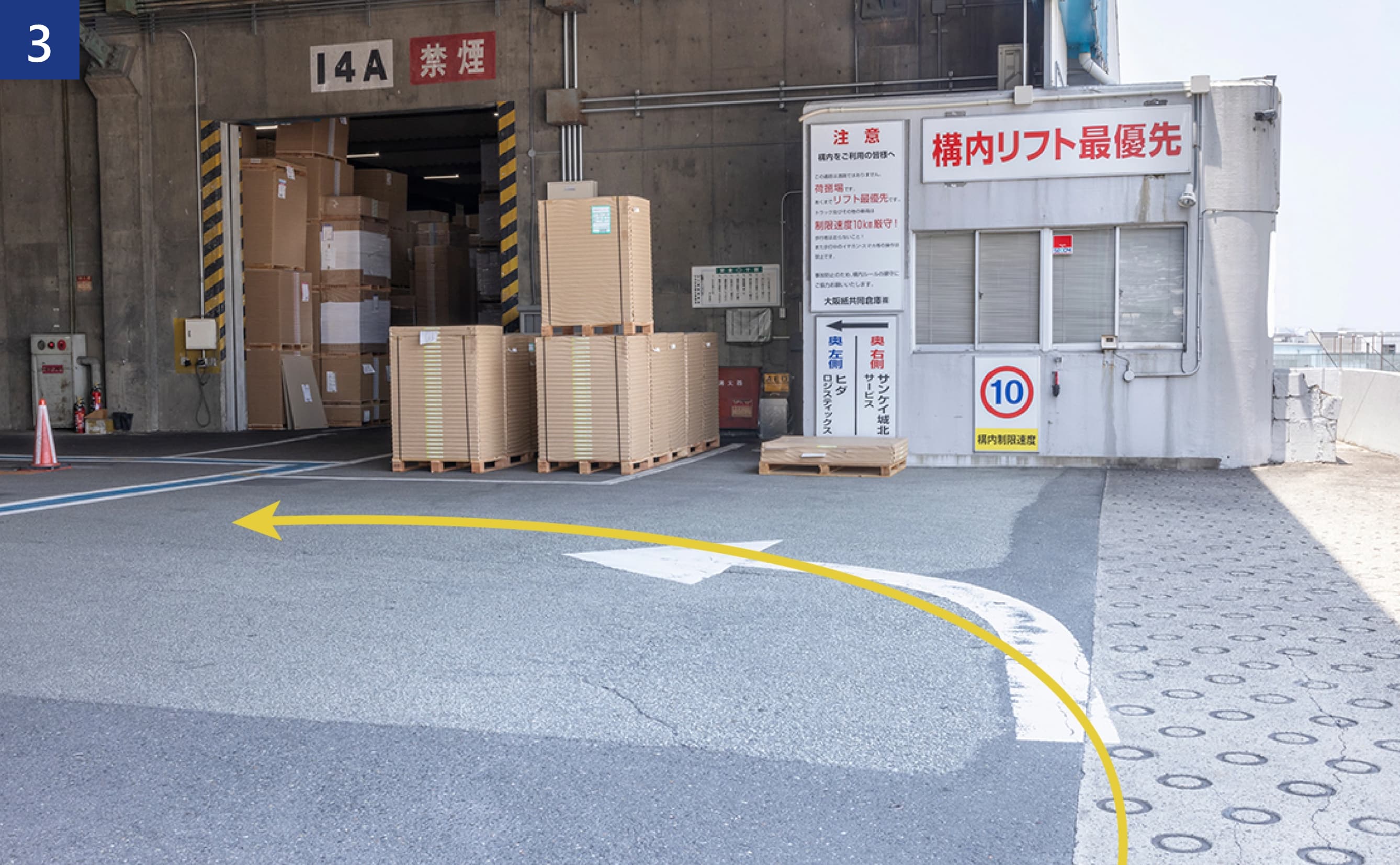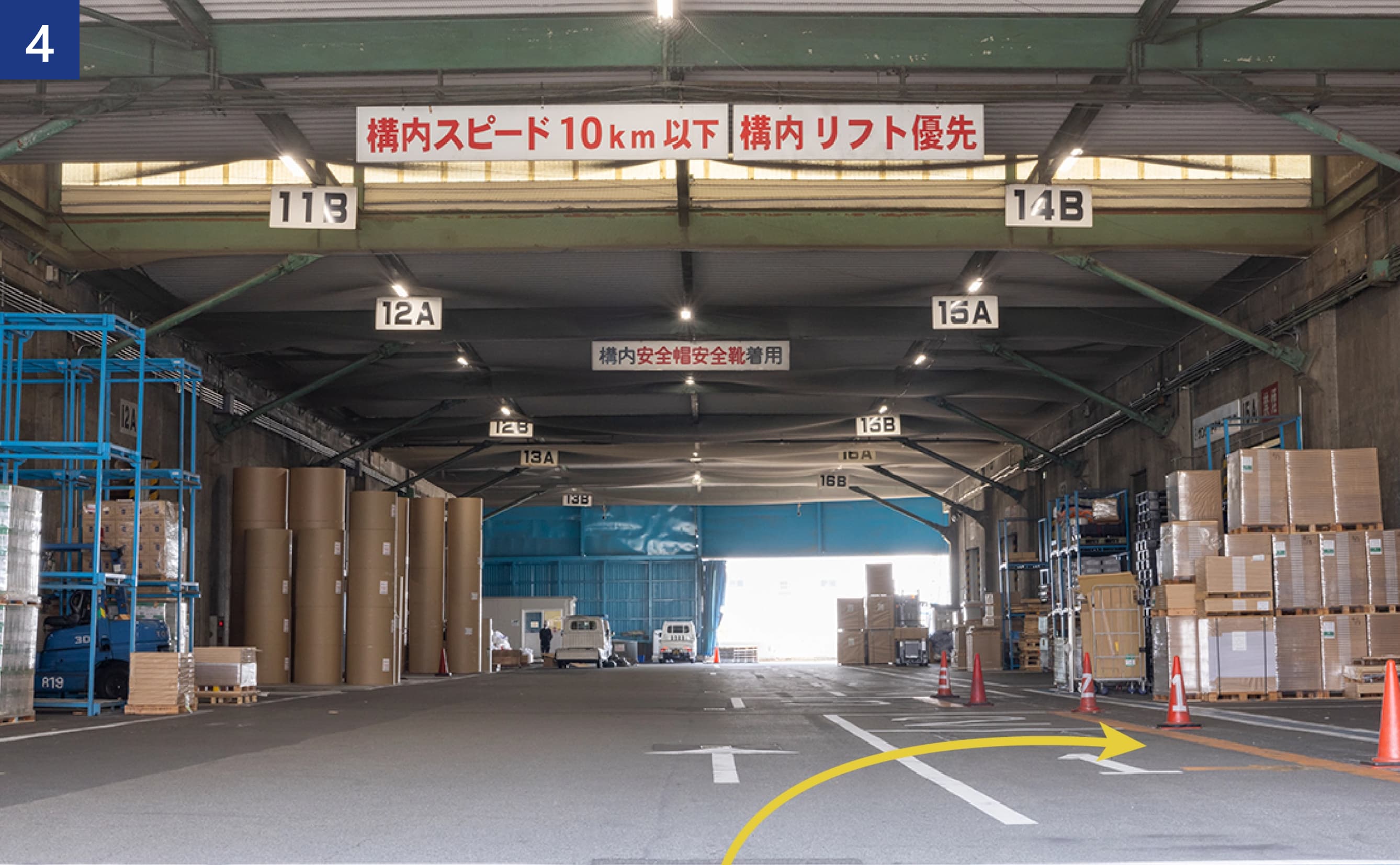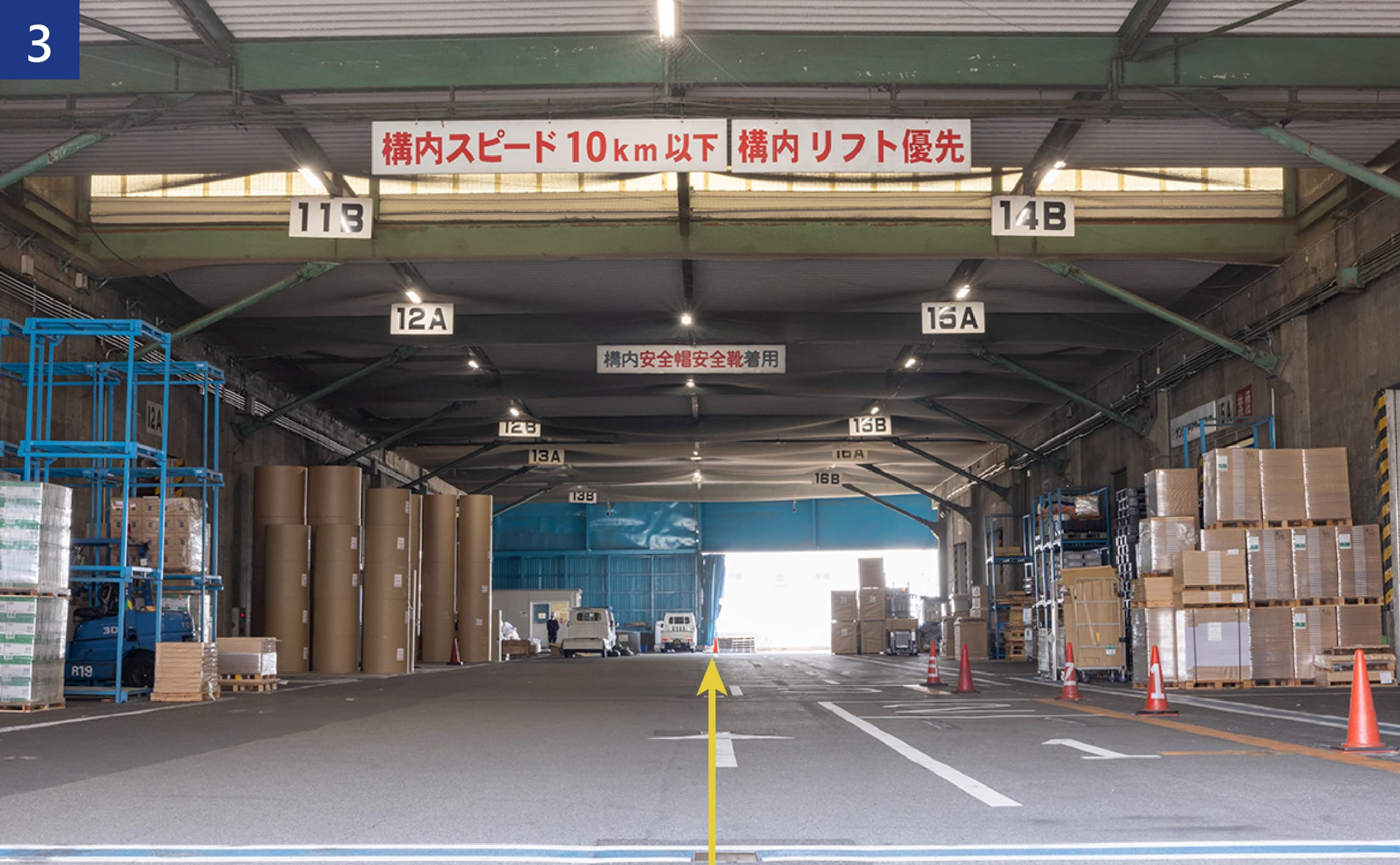 倉庫員(事務員)の誘導に従い1番~3番の枠内に停車 リフトに注意して走行 事務所へ伝票を持参し受付