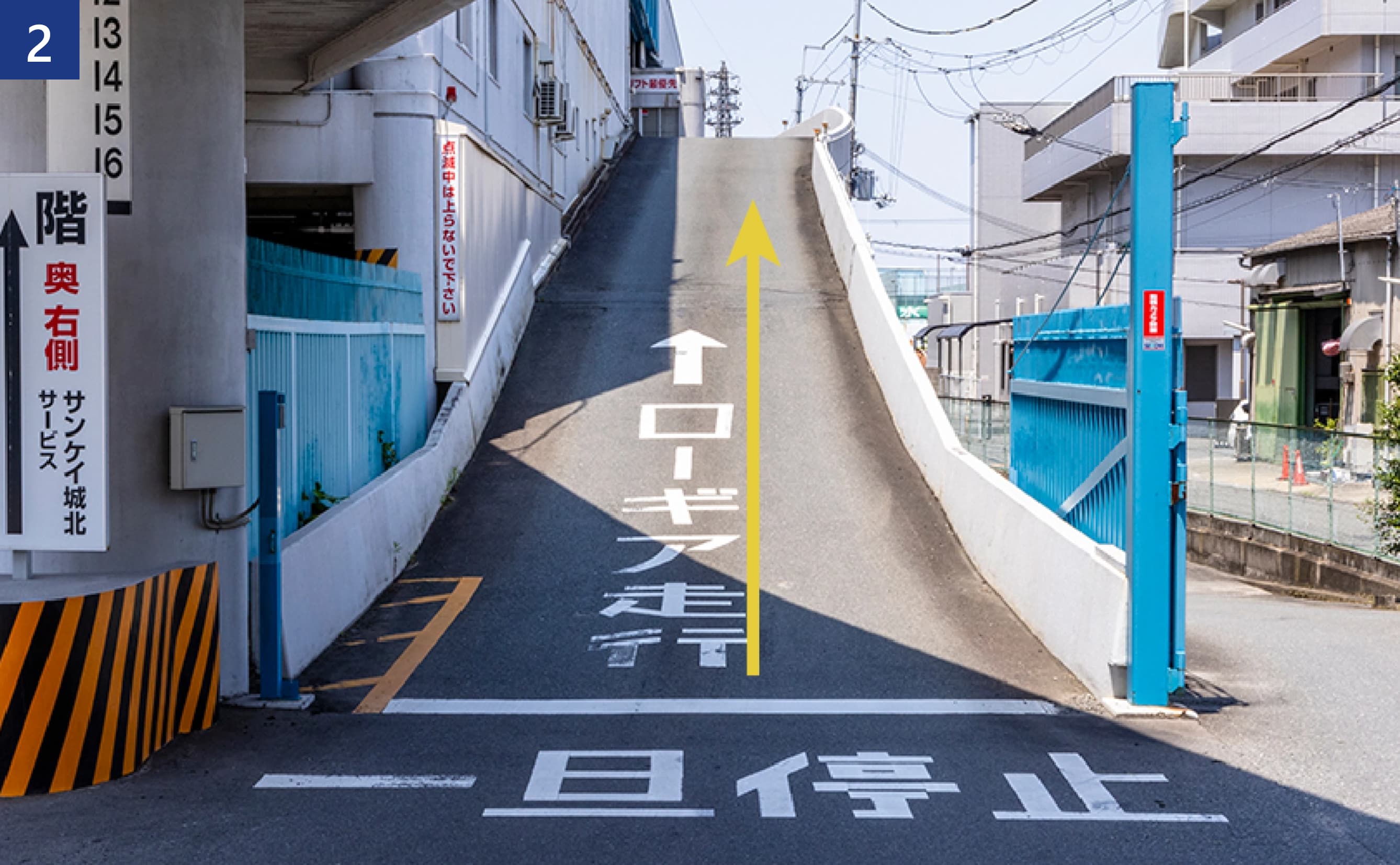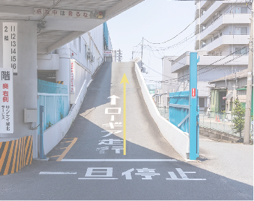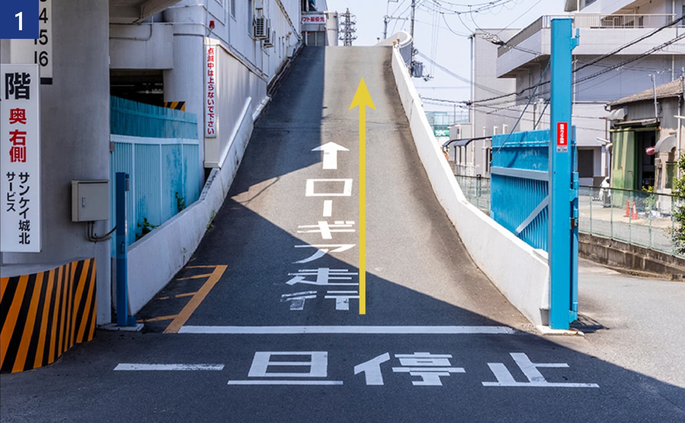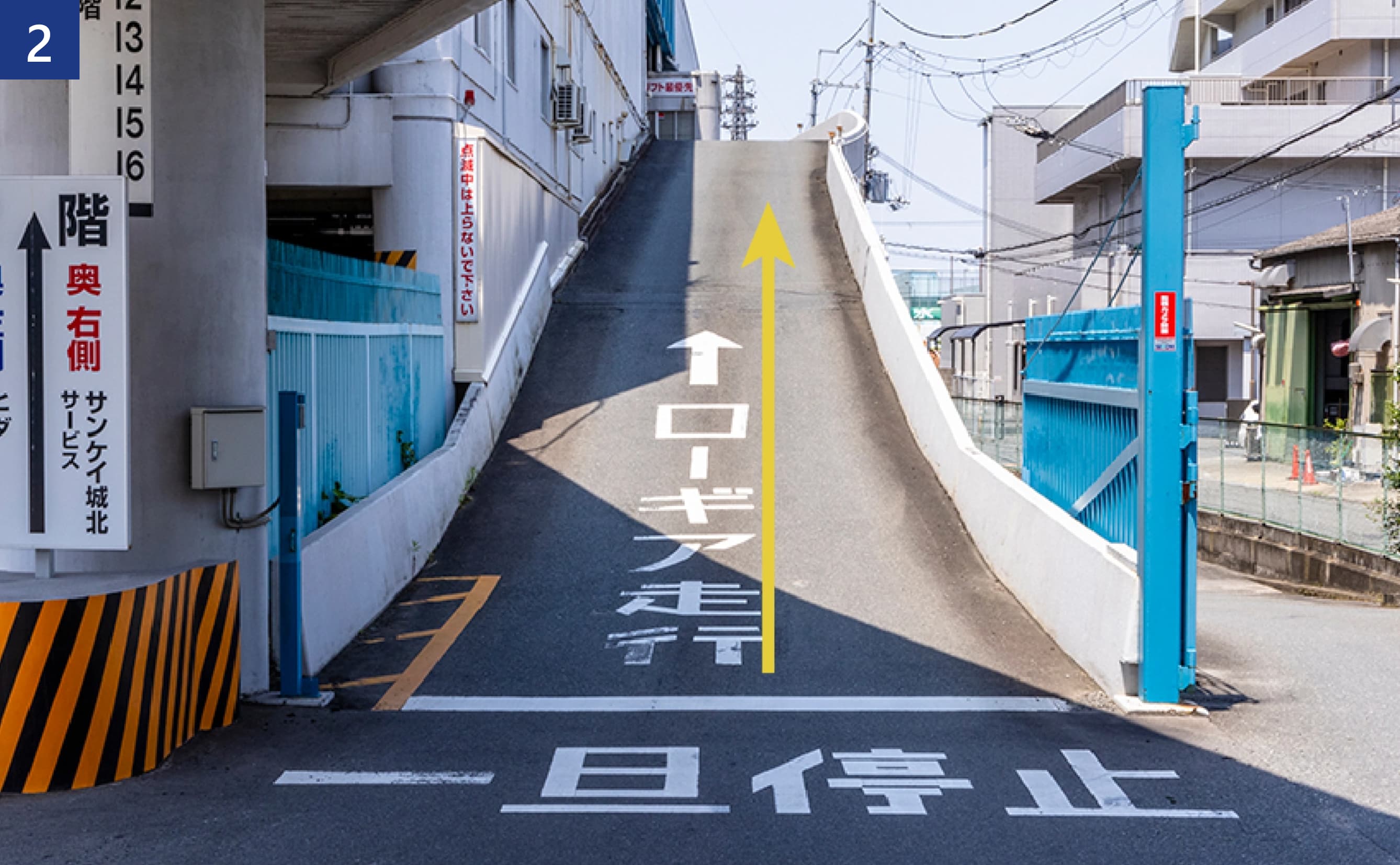 エレベーターを使用しない一方通行のランプウェイ方式の採用、